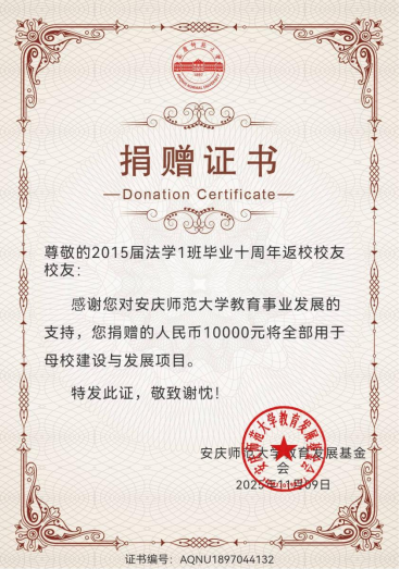 11月8-9日,法学院2015届法学1班组织校友毕业十周年返校活动,向安庆师范大学教育发展基金会捐赠人民币1万元,并深情寄语:毕业十年,心怀母校。下一个十年,祝母校再创更多辉煌!(此捐赠款项用于支持法学院人才培养及各校友交流工作)(撰稿:李丹 审核:钱敏)