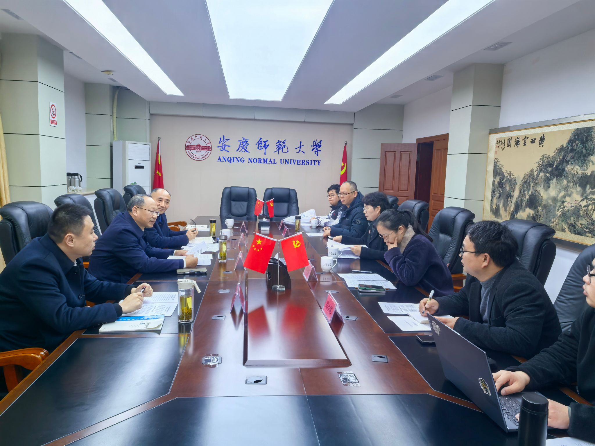 3月17日,安庆市人大常委会副主任江春生一行来校调研地方立法工作,校长彭凤莲热情接待江春生一行,并主持召开座谈交流会。