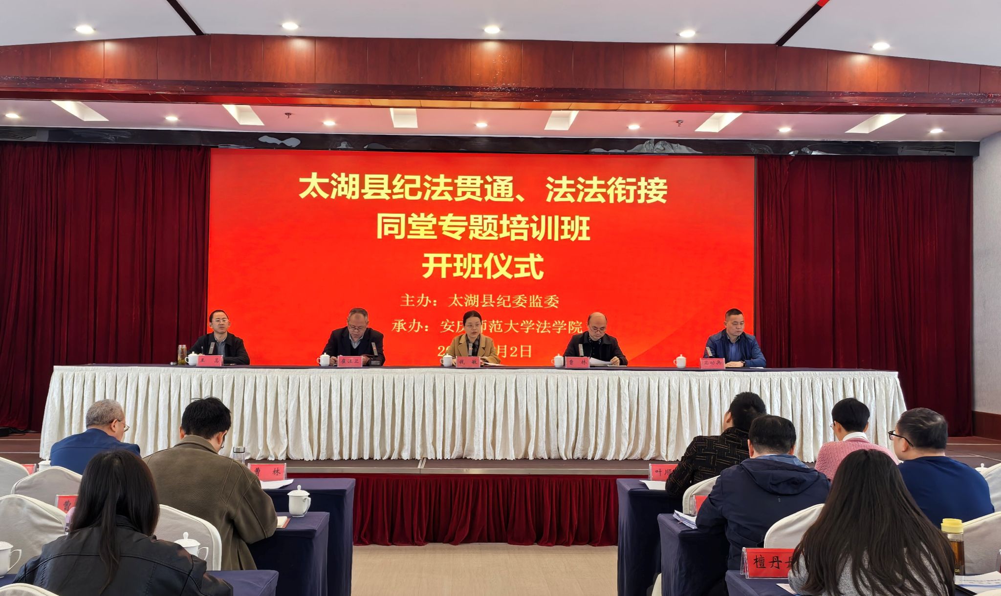 4月2日至3日,由法学院承办的太湖县纪法贯通、法法衔接同堂专题培训班在安庆顺利举行。法学院党委书记钱敏,太湖县委纪委副书记、监委副主任曹林,法学院院长崔汪卫、党委副书记卫功兵,安庆市纪委监委第六纪检监察室副主任王嵩出席开班仪式,太湖县纪检监察系统和司法系统共60余名干部参加培训。