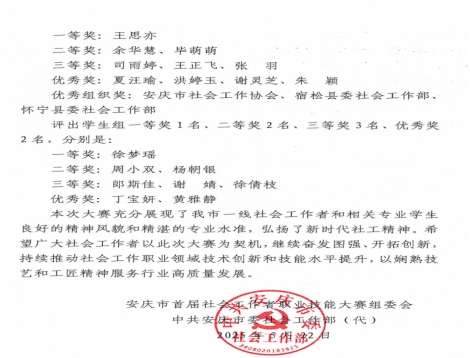 本次大赛由安庆市委社会工作部联合安庆师范大学、市教育体育局、市民政局等共11家单位共同主办,设职工组和学生组两个竞赛组别。法学院承办了我校学生组的选拔与参赛组织工作。经过严格的资格审核、理论知识考核与现场实操技能演示,法学院徐梦瑶同学荣获一等奖;周小双、杨朝银同学荣获二等奖;郎斯佳、谢婧、徐倩枝同学荣获三等奖;丁宝妍、黄雅静同学获得优秀奖。其中,学生组前三名选手徐梦瑶、周小双、杨朝银将代表安庆师范大学参加于6月17日在安徽师范大学举行的首届安徽省社会工作者职业技能大赛决赛。
